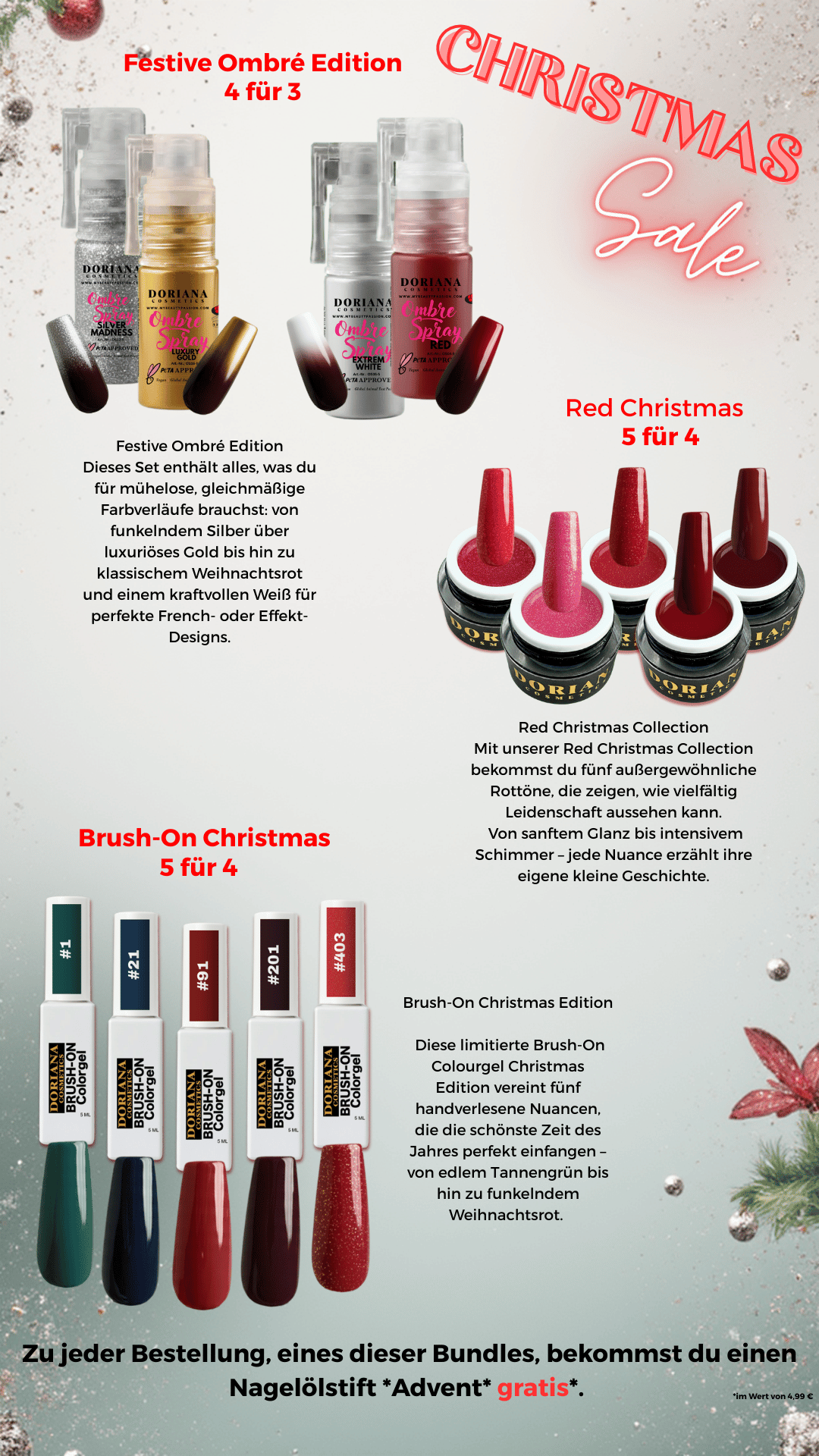 Dieses Set enthält alles, was du für mühelose, gleichmäßige Farbverläufe brauchst: von funkelndem Silber über luxuriöses Gold bis hin zu klassischem Weihnachtsrot und einem kraftvollen Weiß für perfekte French- oder Effekt-Designs.