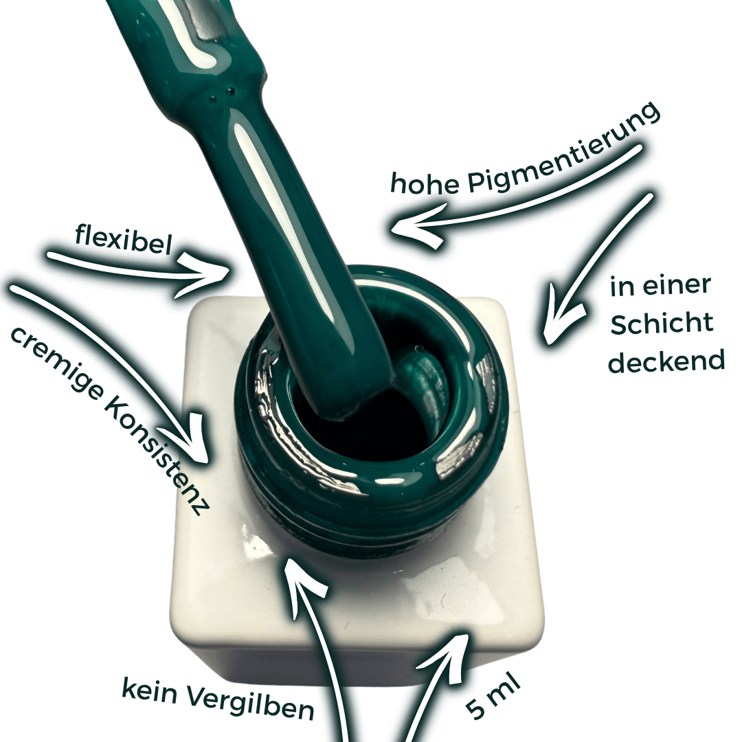 Empfehlung: Optimale Verarbeitung in 1-2 dünnen Schichten. Das Doriana Cosmetics Colourgel *Emerald Grace* bis zum Rand auftragen. Nicht nur für die Optik, sondern auch um das Abplatzen des Gels zu verhindern.