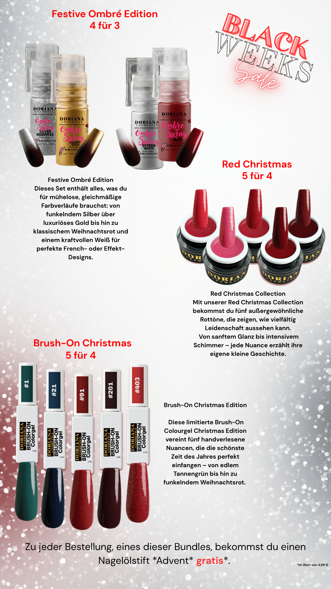 Dieses Set enthält alles, was du für mühelose, gleichmäßige Farbverläufe brauchst: von funkelndem Silber über luxuriöses Gold bis hin zu klassischem Weihnachtsrot und einem kraftvollen Weiß für perfekte French- oder Effekt-Designs.